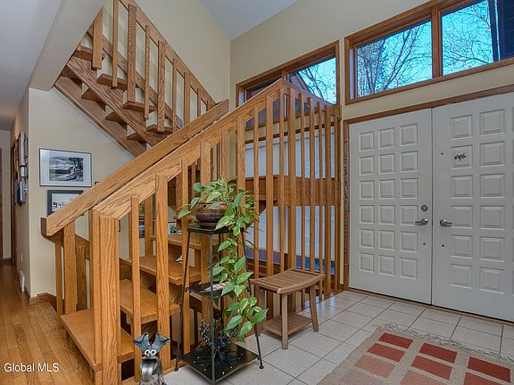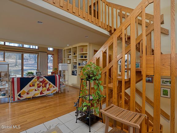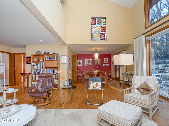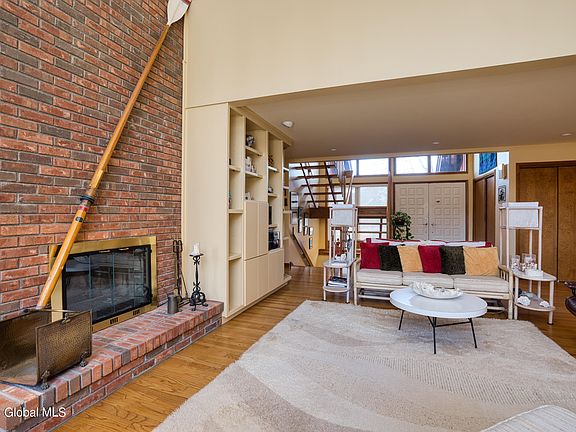 Welcome to your contemporary retreat nestled on a serene cul-de-sac lot! This stunning home boasts gleaming hardwood floors throughout, complemented by large windows that offer picturesque views of your private wooded and landscaped yard. Chef's delight kitchen with a large pantry. First-floor primary bedroom featuring an updated ensuite with built-ins, and large walk-in closet. Primary bathroom showcases a tiled walk-in shower. Bedroom/ home office on first floor. Spacious living area with a brick-faced wall height fireplace, creating a cozy ambiance for gatherings. Skylights and vaulted ceilings enhance the open and airy feel while a loft space offers endless possibilities as a craft or game area. Abundance of storage. First floor laundry. Minutes away from schools, bike path, and park!
