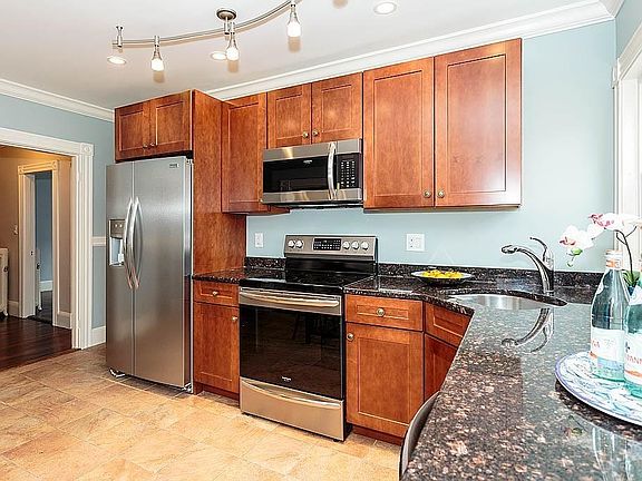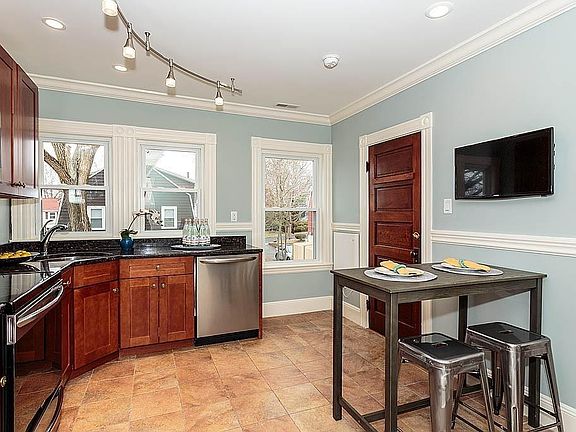 Extremely spacious and newly renovated condo, waiting for you to move in and enjoy Winchester. Updates include new kitchen and baths, central air, replacement windows, gleaming hardwood floors and crown moldings. The eat-in kitchen has been remodeled with stainless steel appliances and granite countertops. In-unit laundry with new washer/dryer is just off the kitchen. 2 new tile baths, one with walk-in shower. 3 large, sunny bedrooms. The wood-burning fireplaced living room, and adjoining dining room with French doors create open space that's perfect for entertaining. Plus, the front of the unit features a dramatic, cathedral-ceiling family room, sundrenched and also an ideal playroom or home office. Large, clean basement perfect for workshop and storage. Parking for four cars. Third floor offers potential expansion space. Location has easy access to downtown Winchester shops and restaurants, Farmer's Market, schools, Middlesex Fells, and train to Boston.