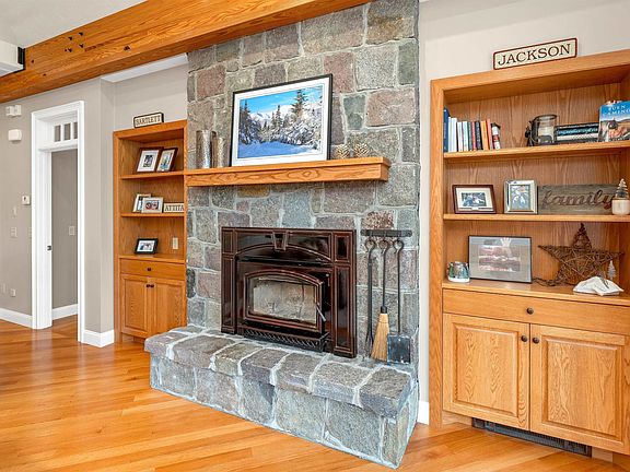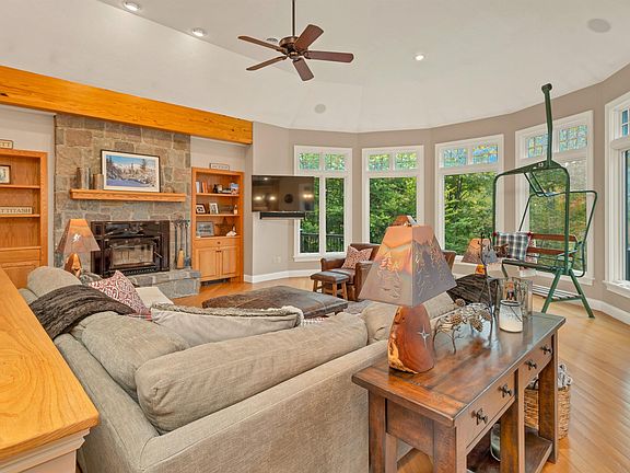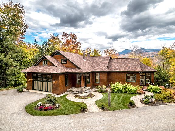This gorgeous, Doc Gilmore built Adirondack style home features a stone, wood burning fireplace and floor-to-ceiling windows in a private setting. From the time you step into the oversized mudroom and venture into the welcoming living room with views to the mountains, you will be drawn in by the exceptional craftsmanship, beautiful flooring, a chef's kitchen with granite counters, a 6 burner gas cooktop and a large breakfast/apres ski bar. The dining area faces the view with access to the all weather deck for grilling and there is an adjacent sunroom for overflow dining and game night. The primary bedroom suite has a private deck and is on the main level with a large closet and en suite bath. The walk-out lower level has a game room with a wet bar and a gas heat stove, two guest bedrooms, including one with a second sleeping area, two full baths and sliders to the patio and a park-like lawn, great for pets and recreation. There is also a hot tub gazebo, fantastic to hop into after a day on the slopes. The room above the mudroom is finished into a family room and exercise space and would also make a great private office, or an additional bedroom. Built in 2007, this home has a 4 bedroom septic, roof just replaced in 2019, central A/C and radiant heat flooring. Located in low tax Bartlett in one of the best locations in the Valley, just minutes from Attitash Bear Peak and Cranmore Mountain Ski Areas and less than 3 miles from North Conway Village. Shown by appointment only.