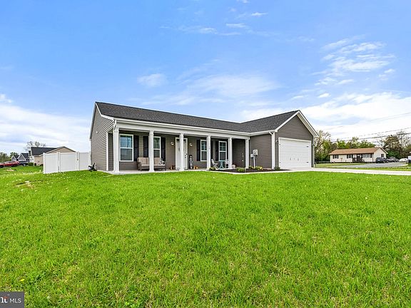 This pristine, three-bedroom, two bath rancher is a looker with its handsome neutral colors, lush lawns, and airy, light spaces. After an inviting front porch with room to relax beckons you inside, you’re welcomed by a high-ceilinged great room combining the common areas with custom blinds through-out the home. There’s ample room to create a comfortable haven for lounging and gathering. The corner kitchen has a bank of cabinets, granite countertops and a matching eat-in island with bonus bar stools, where you’ll enjoy more workspace and additional storage. French doors just past the dining area lead into a sunroom infused with windows, creating a perfect spot for reading or napping. Down the hallway, a generous owner’s suite comes with two walk-in closets and an attached bath containing a double-sink vanity, huge tub, and a deluxe separate shower. Two more comfortable bedrooms each with a walk-in closet, a second full bath, walk-in pantry, as well as a laundry area with the washer and dryer included, round out the home. Out back you’ll find a patio and a white vinyl fenced yard, giving you additional privacy, loads of recreation and gardening space, and the ability to contain your furry friends. Just over the Virginia border into West Virginia, this nearly new 1,644 sq ft home (built in 2020) sits on a huge, half-acre lot and has an attached two-car garage for added convenience.