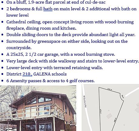 Just under 2 acres & could be 4 BED - 2 BATH; 2 beds + bath on entry level with open concept living room, dining and kitchen, fireplace and full wall of windows. Lower level has additional 2 beds and full bath, laundry and walkout family room. The oversized garage/workshop also has a woodburning stove for winter heat. The GALENA TERRITORY ASSOCIATION, INC is a semi-private, 6,800-acre private recreational and residential lake community located six miles outside the historic city of Galena in Northwest Illinois. Property owners collectively own 1,900 acres of recreational amenities in addition to their own properties. This home is on almost 2 acres of mature treed property. You will see a vast array of native wildlife. You are a resident of the community with access to the Owners Lodge and all ammenities - pools, indoor and outdoor courts, playrooms and exercise facility, horse stables, etc