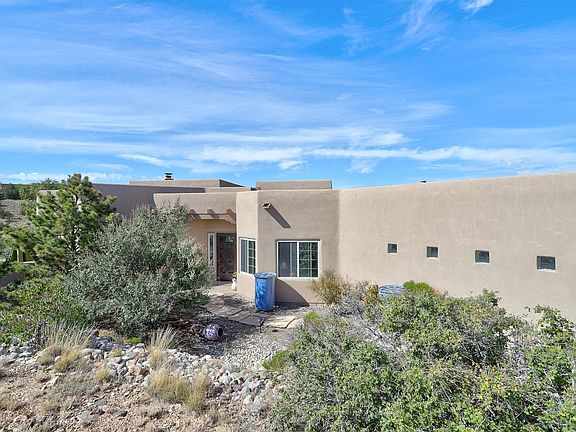 Every detail has been thought of, style, design and craftsmanship. Looking for a view? The 30' wrap around covered patio will put you on top of the world to watch the weather and wildlife. Inside you will find a luxurious home, thoughtfully designed with your ultimate comfort in mind. Large open rooms, chefs kitchen, sunny and bright! Perfectly situated to bring the outdoors in. From the giant windows, to the kiva fireplace, enjoying the deep jetted tub. Come home to where the wild horses visit and the hawks hover. On 2.65 acres situated @ the end of the culdesac on a paved street right in the heart of Placitas. Across the street from the library. Property is on water haul subscription with East Mountain Water. Pure, clean drinking water delivered monthly. 2X1000 gallon tanks in the garage for easy access.