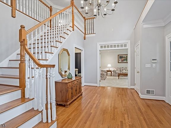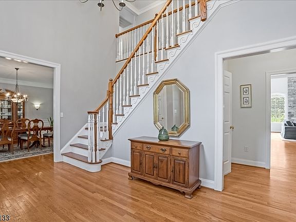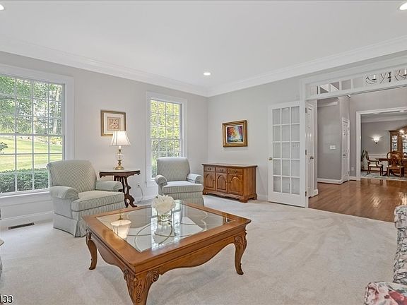 Privately sited on a quiet cul-de-sac, this striking stone and cedar residence, complemented by a three-car garage, is gracefully set on 5+ acres of manicured grounds surrounded by conservation land for lasting privacy. From the circular drive, the property unfolds to a backyard paradise with a saltwater pool, Tennessee sandstone patios, and deer fencing that preserves the landscaping's beauty. Inside, a two-story foyer opens to the formal dining and living rooms, enhanced by French doors and custom millwork. The expansive kitchen, breakfast room, and family room form the heart of the home, where walls of windows and a soaring fieldstone fireplace create warmth and connection to the outdoors. A mudroom with laundry, informal powder room, and back staircase ensure convenience. Upstairs, the primary suite offers a sitting area with gas fireplace, dual walk-in closets, and a spa-like bath. Two bedrooms share a Jack-and-Jill bath, with two more bedrooms and another full bath completing the level. The versatile lower level provides recreation space, a wine closet, half bath, storage, and direct walk-out access to the backyard. Backing to the 160-acre MacGregor Preserve with access to Chester's thousands of acres of parkland, hiking trails, equestrian facilities, and sports clubs, this location blends rural tranquility with commuter convenience, just minutes from farm stands, shopping, dining, award-winning schools, and Midtown Direct trains.