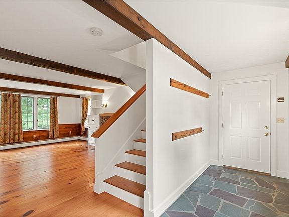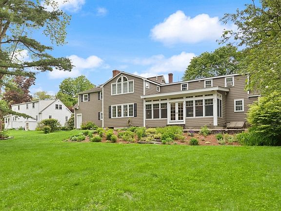 Step into gracious mudroom featuring bluestone flooring and generous closet. The heart of the home is the sunroom bathed in natural light and surrounded beautiful windows with french doors that open to patio,lush perennial gardens a a spacious backyard. This enticing space boasts a custom bar with large ice machine,ideal for entertaining. Kitchen, sunroom and dining flow effortlessly creating a connected and functional layout. Unwind in the family room with expose beams,custom stone fireplace and built ins. The second floor offers primary suites with vaulted ceilings and exposed beams. two additional bedrooms share bath with shower. Large bonus room with half bath can be an additional bedroom, playroom, gym or whatever suits your needs. Convenient to Rte 1,114,128, and 95.Potential for in ground pool.