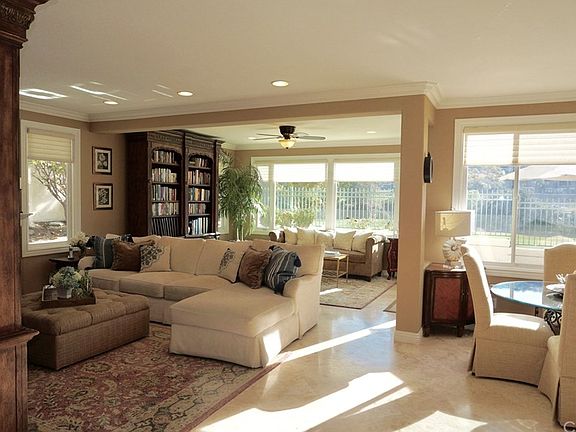 This premier Dove Canyon Golf Course home boasts the caliber of Elegance, Style & Comfort the discerning buyer seeks. An open floor plan featuring an *EXPANDED GREAT ROOM* offers an updated design that takes this home to a whole new level creating a multitude of possibilities! Expansive windows open to panoramic views of the Golf Course, Saddleback Mountains & breathtaking sunsets. Highly upgraded w/ designer decorated features including Leaded Glass doors, travertine floors, dramatic sweeping staircase, custom paint & window coverings, crown molding, French doors, 3 fireplaces & more. Formal L/R & D/R are perfect for entertaining. The remodeled Kitchen is a gourmet cooks dream complete w/ new cabinetry, lighted display cabinets, SS appliances, 6 burner stove, built-in refrigerator, limestone countertops, chiseled travertine backsplash, large center island w/ custom lights & walk-in pantry. Main floor 4th Bdrm is currently being used as an Office w/ custom built-ins. Master Suite has an abundance of windows that showcase the panoramic views, cozy fireplace & sitting area. Master Bath has been remodeled w/ a spa-like feel featuring travertine floors shower & countertops, frameless shower enclosure, separate tub & walk in closet that is Cedar lined w/ built-ins. Secondary bdrms are ensuite & newly remodeled. Located on the 5th hole of the Golf Course, the backyard has a stone hardscape patio w/ multiple sitting areas, manicured landscaping, a custom waterfall & fruit trees.