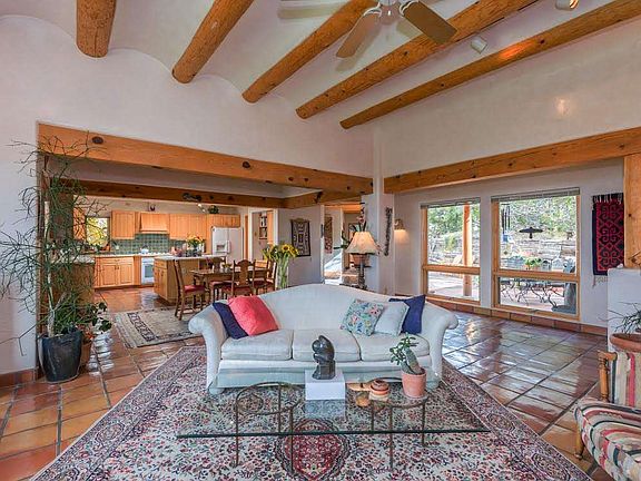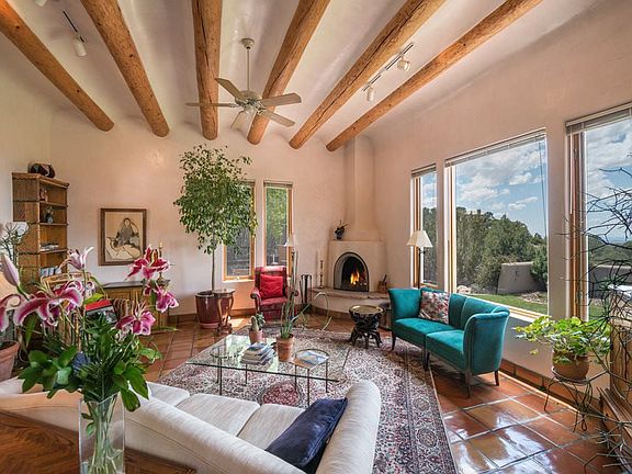 Beautifully sited on 5.25 acres in the foothills of the Sangre de Cristo mountains, this home has the warmth and welcoming qualities todays discriminating buyer is looking for. With its open floor plan and split bedroom design, this home offers numerous spaces to enjoy and create your unique life. The living room has high coved ceilings and invites you to cozy up to the fire from the corner kiva while also enjoying the breathtaking views of the western sky line and the glorious Jemez Mountains. The generously sized master bedroom and private guest suites are complimented by a large bonus room perfect for use as a family room, study/office or artists studio. It could also be made into a 3rd bedroom with the addition of a closet. A greenhouse adjoins the bonus room and opens to a private outdoor seating area. The many outdoor living spaces this home has to offer provide year-round enjoyment. Take advantage of the incredible hiking out your own back door or a beautiful drive down the Old Santa Fe Trail leading to historic downtown Santa Fe, just minutes away.