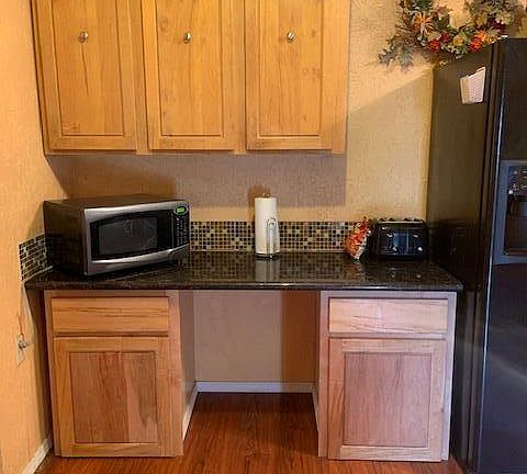 - Kitchen Features: Custom Cabinets, Refrigerator, Electric Range, Free Standing Range, Island