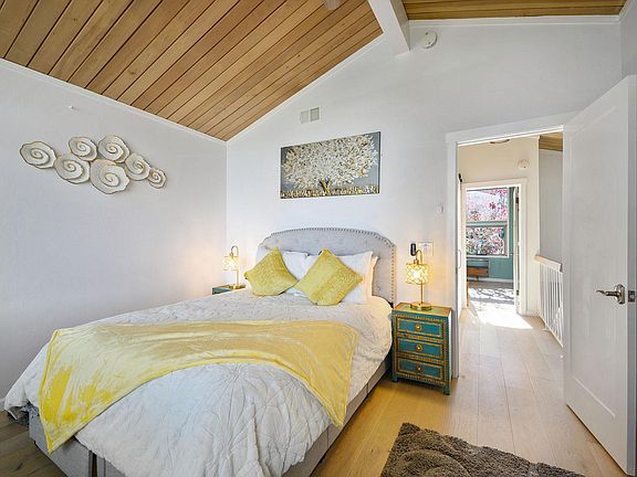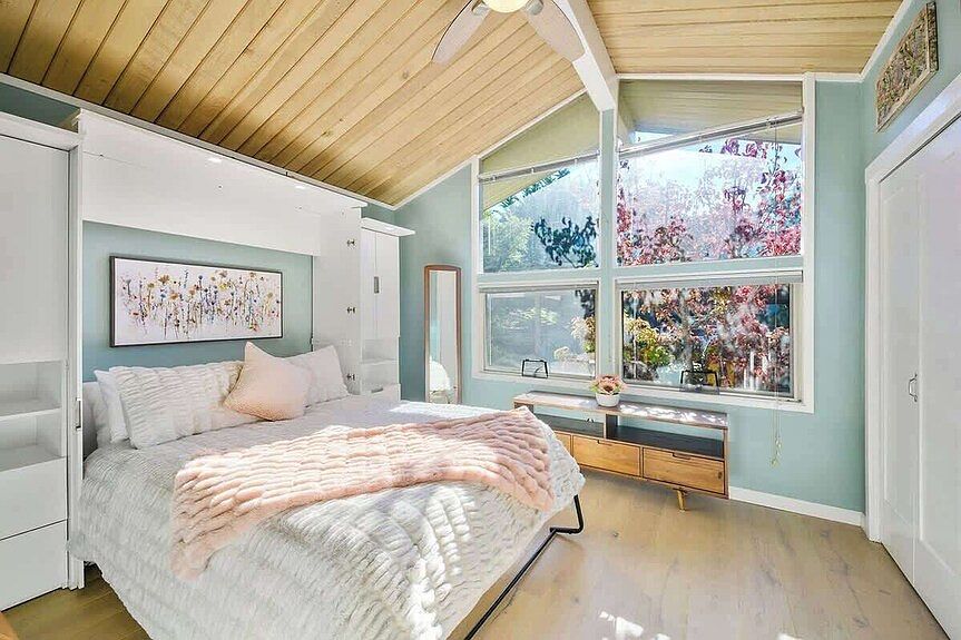 Drenched in natural lighting, the bedrooms are upstairs. Primary suite has a queen bed with large picture windows and bay views plus large closet. Guest bedroom has a queen Murphy bed. When folded up this room functions well as an office or yoga room plus large closet and oversized picture windows