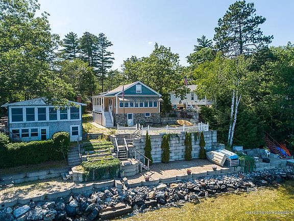 Sunrise Over Sebago! Private sandy beach, clear water, dock system, and a boat. This year-round haven is perfect for summer activities, but Wintering here is perfect for snowmobiling, ice fishing, and day trips to the mountain. The two-tiered patio makes entertainment a breeze, while the heat pump provides a cool interior on the hot Summer days. With 2 bathrooms, and 3 bedrooms including a custom loft with 4 built in beds, there's plenty of room for all. To minimize maintenance, the exterior has been completely upgraded with Vinyl Cedar Impressions shingles, vinyl porch and newer roof. 50' of private water frontage and dock system, additional rights to the Association beach with a private cove, and a boat slip means piece of mind and fun in the sun. A partially-finished walkout basement is great on a rainy day, and 300' of unfinished space over the 4-car garage would be ideal future space for the in-law's or a rental unit. A place like this does not come along every day!