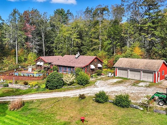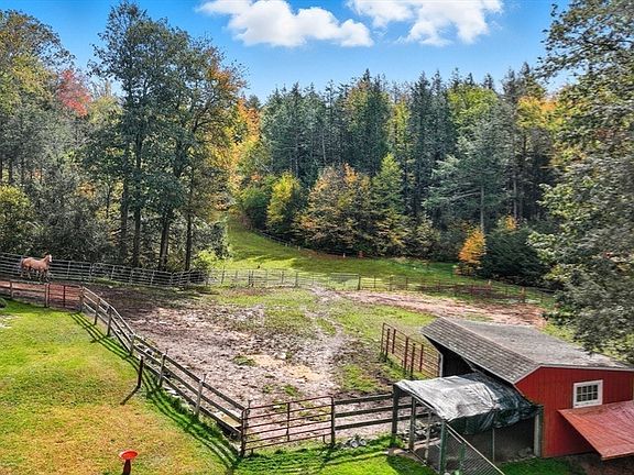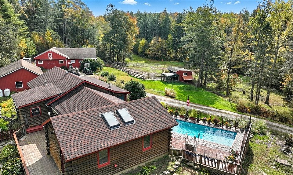 Escape to your own private sanctuary with this meticulously restored equestrian farm. The distinctive log cabin showcases vaulted ceilings and wide-plank pine flooring throughout, and a floor-to-ceiling stone fireplace at the heart of the home. The expansive primary suite features an indulgent jacuzzi tub, creating your personal retreat. With two more bedrooms and a second full bath, there’s plenty of room for guests. Horse enthusiasts will appreciate the facilities such as the 8-stall barn with hay loft and multiple pastures featuring attached runouts. There is also a 3-bay garage for ample workspace and storage. Outdoor entertaining is a breeze with a salt-water pool, screened porch, two decks, and stone patio. The multi-use farm also includes a full-property generator ensuring uninterrupted comfort. Nestled among mature woods, this remarkable estate offers the perfect blend of country living and modern amenities, all just a trail ride from Huntington State Forest's natural beauty.