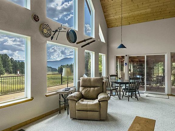 Cabin in the woods! Take in panoramic views from the massive deck of this well maintained home. Surrounded by soaring pines and aspens on one side and the park like setting of the greenbelt on the other. Hiking trails are literally right out your back door, and the national forest is close by. Quality construction and owner pride stand out as you enter this 3 bedroom 2 bath home. It features an upstairs master suite with a large closet and beautiful french doors. Downstairs, an open concept living/dining/kitchen design extends outside to the covered deck, allowing for easy flow and effortless entertaining. Bright, easy to love, low maintenance, furnished and move in ready. this cabin is complete with neutral paint colors and flooring, upscale cabinetry, custom railing, ample space in the laundry/mud room for seasonal gear, and a one car garage. Located just minutes from the Angel Fire Golf and Country Club and the Angel Fire Ski Resort.