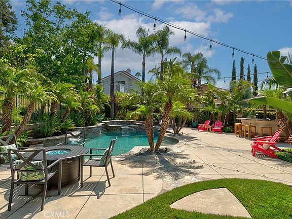 Welcome to your dream home in the exclusive community of Foothill Ranch, nestled in the hills of the Saddleback mountains! First time on the market, this newly renovated turn-key home showcases meticulous pride of ownership. Boasting 4 bedrooms and 2.5 baths, with the 4th bedroom converted into an office space, this home offers flexibility and luxury. Upgraded double-paned windows with acoustical glass and window coverings, along with the recessed lighting throughout the home, make this home light and bright. Discover beautiful travertine floors downstairs, complemented by dramatic black kitchen cabinets and stunning granite countertops. Stainless steel appliances, including a GE Monogram built-in fridge and Wolf cooktop, elevate the culinary experience. A large center island with seating and a breakfast nook provides the perfect spot for casual dining. The family room is highlighted by a stone fireplace and built-in wine rack, while the formal dining room features built in storage. The living space looks out onto your private tropical backyard paradise, complete with mature palm trees and lush landscaping. Lounge by the pool and spa surrounded by custom hardscape of natural stone or entertain guests at the outdoor BBQ with its thatch umbrella, bar seating, and outdoor speakers. Premium outdoor string lighting illuminates the space, creating a magical ambiance after sunset, while block walls surrounding the yard enhance privacy. As you move upstairs, the space opens to a large family room, perfect for small kids or a teenage hangout space, and new carpet adds to the cozy appeal. The primary suite features a vaulted ceiling, ceiling fan, and a luxurious bathroom with dual vanities, a large shower and beautiful glass accent tile. Each bedroom includes new upgraded mirrored closet doors. You’ll notice as you arrive to this home, you’re greeted by an extra-long driveway leading to a 3-car garage complete with custom cabinets, providing ample storage. The garage and expansive driveway allow parking for up to 12 cars, ensuring convenience for guests and residents alike. Convenient proximity to shopping, restaurants, and theaters, plus, enjoy Foothill Ranch amenities such as a community pool and spa, clubhouse, tennis courts, sports facilities, parks and picnic areas. Low HOA and no Mello Roos taxes. Foothill Ranch also backs the Whiting Ranch Wilderness Park and is close to the 241 toll road.