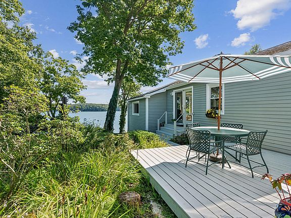 As you step inside this stunning home, your gaze is immediately drawn to the breathtaking 100 feet of waterfront directly ahead. Elevated above the ocean this home offers unparalleled water views from almost every angle. The living room and dining area create an illusion of floating on water, while two of the bedrooms provide equally dramatic vistas—one with a private deck and the other featuring a cozy window seat. Natural light floods the space, with expansive windows framing the water views, skylights brightening the kitchen, and enhancing the downstairs bathroom. Outside, a mature perennial garden bordered by tall hemlocks ensures privacy and includes three serene sitting areas overlooking the water. The kitchen features granite countertops, stainless steel appliances with pantry. The adjoining dining and living rooms feature gleaming oak floors, adding warmth and elegance to the space. Upstairs, you'll find two additional bedrooms and a full bathroom. The lower level offers a versatile bonus room currently set up as an exercise area, jacuzzi, and ample storage space. The property includes a one-and-a-half-car detached garage, conveniently located by the road—a valuable feature during winter months. Outdoor enthusiasts looking to explore the river and beyond will love the stone stairs leading down to the water, surrounded by lush Concord grape vines. The property comes with a mooring and two double kayaks, making it a boater's paradise with sheltered waterfront access to Casco Bay. Situated in the quiet, historic neighborhood of South Freeport, once home to a renowned boatyard, this location offers a unique blend of tranquility and convenience. Enjoy easy access to local amenities: just 5 minutes to I-295 and Route One, 5 minutes to Freeport village, 20 minutes to Portland, and 15 minutes to Brunswick. South Freeport also boasts its own marina, yacht club, and lobster pound, making it a truly exceptional place to call home.
