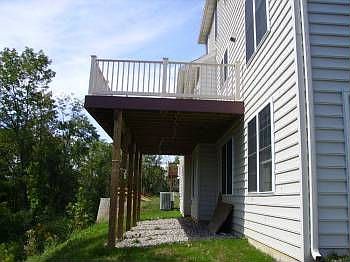 Main floor consists of a two story ceramic tiled entry room, formal living room, formal dinning room, an office, large laundry room, powder room, large eat in kitchen with eat at center island, doors to 12 X 20 deck. Two story recreation room with stone fireplace and two skylights. Home has two oak staircases (one at entry door the other from recreation room) leading to landing/hall that takes you to 4 bedrooms and hall double sink full bath. Master bed has his and her walk in closets, super bath with jetted tub, double bowl sink and a 10 X 13 foot sitting room. All other bedrooms have walk in closets. All floors are oak hardwood or ceramic tile, only carpeting is on staircases. Basement is finished as an in law apartment with full bath, eat in kitchen, doors to walkway and patio that is covered by upper deck. Hall to four more bedrooms, recreation room, a large utility room and huge storage room. Outside is completely landscaped around entire home with beautiful lighted retaining wall and 3 fountains.