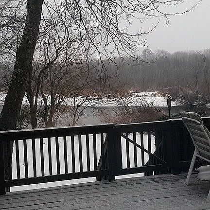 White Vinyl Siding with Black Shutters and a new roof situated right on the Black River.