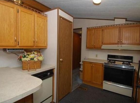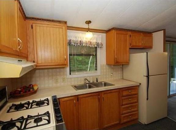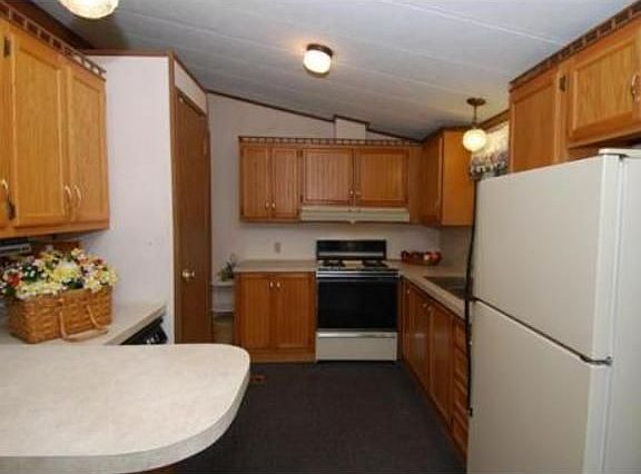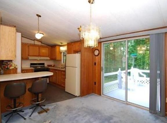 Serenity is the mood of this tranquil park setting and manufactured home. Enjoy cool summer evenings relaxing on your deck overlooking stately trees offering complete privacy, gentle breezes and all that nature provides. Come inside where your wicker furniture will feel right at home on the front enclosed porch. Updates include newer tilt-in windows in the family room and master suite, kitchen cabinets and counters, stove and hood. Family room boasts stunning fireplace with hearth, cathedral cei