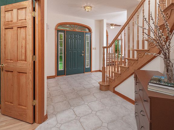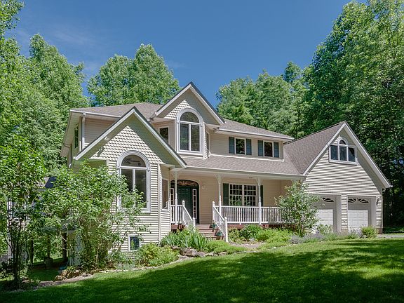 This sunny, move-in ready custom colonial welcomes visitors with a gracefully-curving private road. The home features an open, traditional floor plan, red oak wood floors, and plentiful light from generous windows, skylights and recessed lighting. The large eat-in kitchen features cherry cabinetry, a center island with a granite countertop, large pantry closet, and sliding doors overlooking the backyard which allow access to the two-tier rear deck. The family room features a high-efficiency enamel wood stove, high ceilings, and skylights. A combination living room and dining room allows a casual flow to the spaces and features a living room area with cathedral ceilings and multiple, large windows overlooking the front yard. The first floor features the 4th bedroom of the home which is currently used as a den/office. A over-sized, custom-designed 3-season porch unites the living spaces of the house with the natural setting. A well-located mudroom/laundry room connects the living spaces of the home with the main level garage and features a washer, dryer and large coat closet. The 2nd floor is accessed by a turned staircase with decorative accents. The master bedroom suite features a walk-in closet, en suite bathroom and sitting room. Two additional bedrooms on the 2nd floor feature large double closets. The geothermal field is sized to allow the large bonus room to be finished for use as a 4th bedroom on the 2nd floor with the addition of an additional air handler. An over-sized, first-floor, 2-car garage features automatic openers, separate access from the backyard, and access the home through the mudroom/laundry room. The large, unfinished, walkout basement features high ceilings, and lots of natural light through large windows and sliding doors. Exterior features include a covered front porch with Victorian accents, a 2-tiered deck, and a paver walkway, all of which unite the home with its natural surroundings which are accented by perennials and specimen trees. Systems include multi-zone geothermal heating/cooling, ceiling fans, central vacuum, 400 amp electrical service, water softener and neutralizer, 4-bedroom septic, and well water. This property is located in a section of Lebanon Township valued for its easy access to shopping, golf courses, country clubs, private and public schools, commuter highways (Interstate 78 and 287), buses and trains to NYC, and airports. Public schools at every level are well-rated by www.greatschools.com.