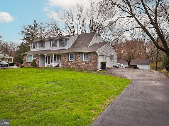 Center Hall Colonial style home located in the highly desirable Brookdale section of New Britain township. Foyer entrance with tile flooring, wainscoting, crown molding and chair rail. Spacious living room with bay window, custom wainscoting, Glass French doors and crown molding. Separate formal dining room with crown molding and chair rail. Spacious kitchen offers custom cabinetry with cappuccino finish, granite countertops, pantry storage, center Island, tile flooring and separate eating area with sliding glass doors offering access to rear Bluestone patio. Large great room with wood flooring, additional access to rear patio and wood-burning fireplace with Stone hearth. Main bedroom offers original hardwood flooring exposed, linen closet storage, walk-in closet, chair rail and crown molding plus a 3-piece En-Suite bathroom. This main bathroom has tile flooring, stall shower with glass doors and tiles surround, vanity with under cabinet storage and granite countertops. Three additional bedrooms with ample Closet storage and hardwood flooring exposed. 3-piece center hall bath with tub shower combo, tile flooring, and custom vanity with cabinet storage and granite countertop. SIX TOTAL GARAGES: Four car detached garage, two additional garages with inside access, full walk-up basement, 6 panel doors throughout, first floor laundry and Central Bucks schools. Spacious house in an exquisite location. Tour it soon.