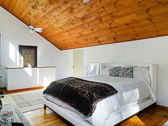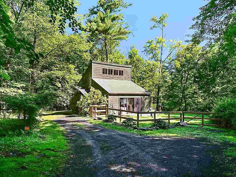 LOCATION+design+upgrades=HAPPINESS. Seldom does a perfectly sited contemporary like this ever come to the market. 3 minutes stroll to the cascading waters of the Sawkill and 5 minutes to the center of Woodstock. Easy to enjoy all the shopping, restaurants and hot entertainment spots that have recently opened that have added to the vibrancy of this eclectic community. Located at the end of a private road it is tucked down a winding driveway so the house can not be seen from the street. Surrounded by towering pines and seasonal mountain views this open floor plan home with vaulted ceilings, recently renovated kitchen, abundant light and great outdoor decks for entertaining. The home features wide board pine floors, wood beamed ceilings, cozy woodstove and a huge loft overlooking the living area that could be another sleeping space, media area or at home work area. The owner just added new central air conditioning and fenced in a large part of the yard for the dog so no worries if you are bringing yours upstate. Two main floor bedrooms with bath and plenty of storage space. Just move in and enjoy this beautifully maintained and updated Woodstock home.