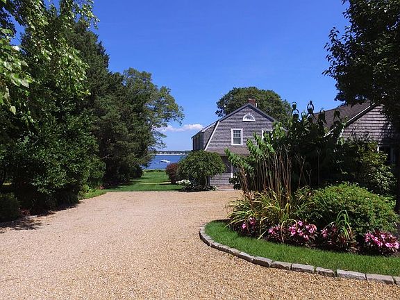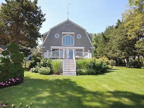 Marion...'Seal Rock' - Waterfront Perfection! Handsome Dutch Gambrel is sited on a double lot and features stunning water views...Professionally landscaped, the property offers perennial gardens, privacy hedging and a spectacular, gently rolling lawn to the sandy beach and water's edge...Highest quality finishes are immediately evident upon entering the turnkey home; the open floor plan includes a living room with compelling water views, deck, custom Scandia cabinetry and a gas fireplace with unique beach glass surround...dining room and skylit kitchen with custom cabinetry and large dining island. A bedroom and bath complete the first floor. Above, master bedroom suite with floor to ceiling arched window affords gorgeous ocean views and luxurious bath, three children's/guest bedroom and additional full bath. Finely appointed with white washed ash wood floors, bead board, deep crown moldings, wainscoting and too many custom details to list...Sophisticated seaside living at its best!!!