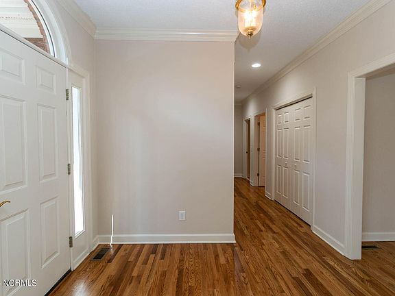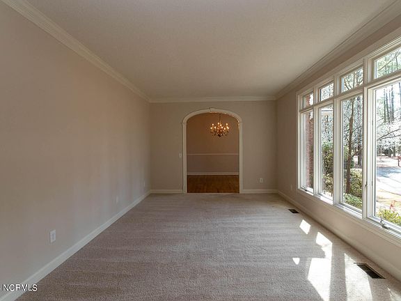 Nice brick home on a quiet cul-de-sac overlooking the 1st fairway of the Magnolia course in desirable Pinewild Country Club offers an open, bright floor plan, all one level. This home has beautiful newly refinished hardwood floors throughout most of the main living areas, crown moldings, arched entries from the foyer to the living room and also to the dining room. The family room has built-in cabinets and bookcases and space for large screen television, wet bar with a wine cooler, ceiling fan, and brick fireplace that is also open to the kitchen, sliding glass doors with side panels that open to a screened porch. A spacious kitchen has lots of cabinetry, white appliances, an island with electric cooktop and built-in desk. The dining room has an elegant chandelier and chair rail molding. The primary suite features a spacious bedroom with carpet, ceiling fan and sliding glass doors to the screened porch, two walk-in closets and bathroom with double sink vanity, corner whirlpool tub and step-in tiled shower. Both guest bedrooms have carpet and ceiling fan. The garage has golf cart storage with automatic door open, workshop area and two storage closets. Enjoy great golf views from a deck across the back.