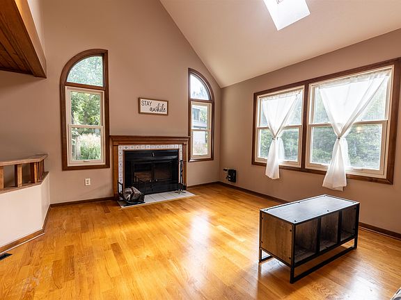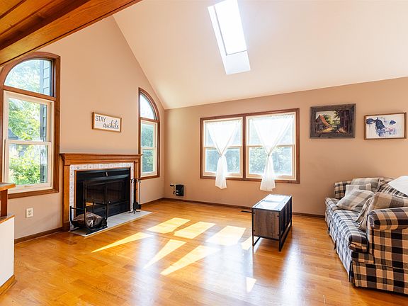 Nestled on a 0.69-acre lot, this charming getaway offers an open front yard and a private wooded backdrop that adjoins expansive green space on two sides. The main level is bright and welcoming with vaulted ceilings, skylights, hardwood floors, and a spacious great room anchored by a wood-burning fireplace with a custom tile surround. A generous dining area and galley kitchen with granite countertops and tile flooring flow seamlessly, while a full bath, laundry closet with stackable washer/dryer, and a fun small loft area accessible by wall mounted ladder add convenience and character. The walk out lower level features a comfortable guest bedroom, a primary suite with access to the backyard, a full bathroom, and a utility/storage room. Outdoor living is just as enjoyable with a screened porch and a large rear deck overlooking the trees. Additional highlights include an asphalt driveway and large parking pad area. Check out this charmer today!