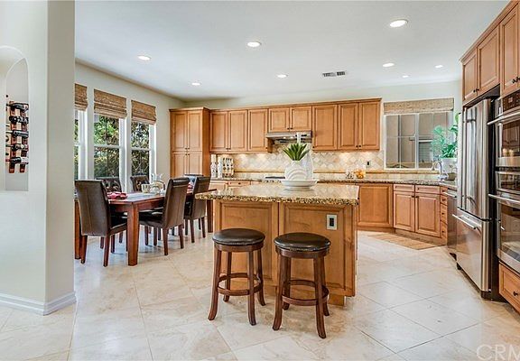 Ideally located backing the gorgeous Hick's Canyon walking and jogging trail, this turnkey Residence Two executive home with 3675 sq. ft. offers four bedrooms, including a secluded downstairs junior suite, and an added huge bonus room with custom built-ins. Designed with many features of architectural interest, this open flowing plan offers a formal living room with impressive fire place; a separate formal dining room with French doors; a spacious family room with inviting raised hearth fireplace and built-ins; and a gourmet kitchen which includes a generously sized island with breakfast bar and a separate nook for informal meals. Kitchen upgrades include gorgeous granite counters and a professional grade 6 burner gas cooktop and fan that vents outside. The sumptuous master suite includes a luxurious bath with dual sinks, soaking tub, oversized shower, roomy walk-in closet with custom organizers and a view balcony. Stunning décor includes extensive travertine tile flooring, decorator window treatments, recessed lighting and ceiling fans. Recently upgraded with dual slim line, high efficiency FAU and AC units. An entertainer's delight, the private backyard with premium location overlooking the trail includes a built-in BBQ with refrigerator and lots of counter space for entertaining, an inviting fireplace and a large covered outdoor living room for relaxing. School attendance area includes award winning Northwood High, Sierra Vista Middle and Canyon View Elementary schools.