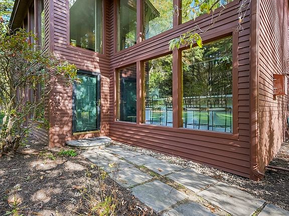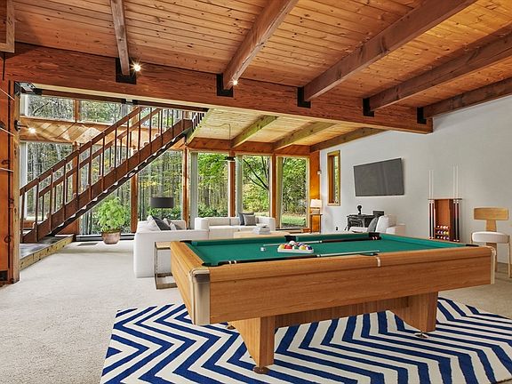 Wrapped in privacy, this stunning contemporary, beautifully set on nearly an acre abutting the state forest awaits! With 3,664 sq. ft. of living space, this home is designed to capture its natural surroundings. Soaring windows on both levels offer serene wooded views. 1st floor features a spacious living room w/ dramatic windows & exposed beams, wood stove, dining room, and well-appointed kitchen with gas stove, abundant cabinetry and seating for 6 at the breakfast bar. 2 bedrooms & a full bath complete the main level. Upstairs, the expansive family room provides space for multiple sitting areas & has a wall of windows. The 2nd floor office offers flexibility - large enough for a guest room too. The primary suite is a retreat of its own, featuring a private deck, cozy gas stove, oversized walk-in closet, & luxurious bath with a walk-in shower, dbl vanity, & generous storage. Add’l highlights include a 2-car garage w/ storage space, a rear patio, & tranquil wooded views from every room!