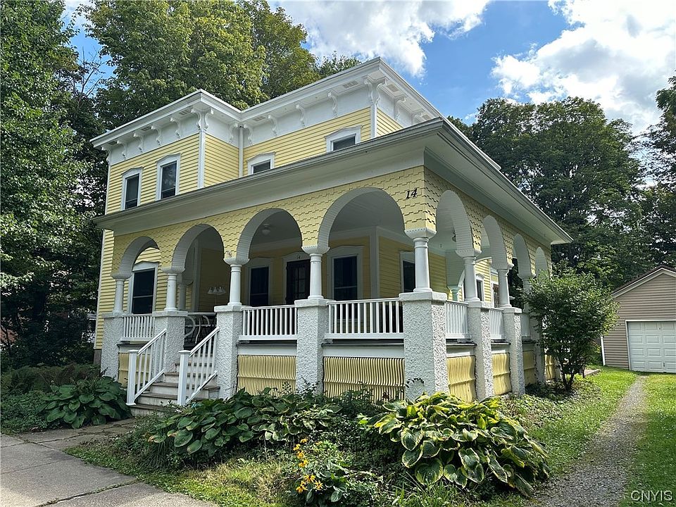 Welcome to this spacious historic home! The wraparound porch sets the tone of this charming house, upon entering you have three rooms open to each other, living room, formal dining room and parlor separated by french doors. The shelf lined den is perfect for a home office space or hobby room. Kitchen features plenty of cupboard space and counter space, galley area with separate sink ideal for the home baker or chef! Second floor has a large laundry are with additional space for that would be a great for a craft room. Three bedroom and 2 full baths round out the upstairs living space. Exterior boasts a just right back yard with stone patio, shed for additional storage and oversized one car garage. A rare find ready for its next family.