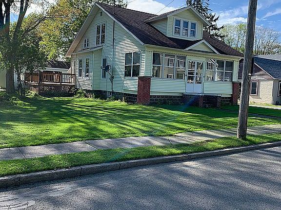 Nice quite village 4 bedroom home, 2 baths, enclosed front porch, rear deck, 2 1/2 car garage with half bath, full basement, huge back lawn for kids to play
