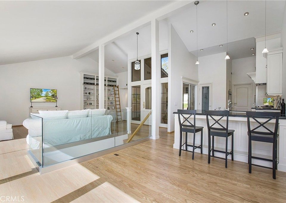 New roofTravertine courtyard entryHigh-end cabinetryStep-down denWalk in closetReal hard wood floorsGlass railings