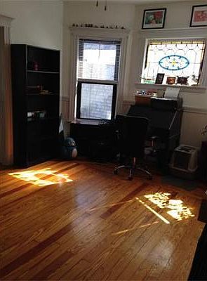 Nice and bright 1 to 2 bedroom boasting period details in woodwork and stained glass window. Hardwood floors throughout with great retro style vinyl in the kitchen. Sit out on the enclosed front porch with your coffee and enjoy the sun. Large kitchen w/a pantry. Nice tile bathroom. Extra storage or sitting area on the enclosed rear porch