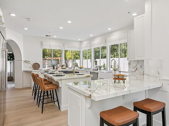 Tucked away at the end of a cul-de-sac in desirable North Napa, this elegant light-filled home is a show-stopper. With its soaring ceilings and 5 +/- foot-tall kitchen windows overlooking the park-like back yard, this home brings the outdoors in. A dreamy kitchen features an abundance of new porcelain counter space, a center island, a workstation sink, new KitchenAid gas stovetop, built-in fridge and walk-in pantry. The kitchen is open to both the family room and the living/dining rooms. Living and dining spaces are enhanced with wainscoting and a gas fireplace. Perfect floorplan with a high-ceilinged bedroom and full bath on the main level, and 3 more BRs upstairs, including the elegant primary suite. The recently remodeled primary bathroom's double-sided fireplace & soaking tub create a relaxing retreat. In the back yard, there's a new pergola with party lights on one side, and a veggie garden on the other. A neighborhood playground is accessible from the back gate and is just a few yards away. Too many upgrades to list, including a new HVAC system. A 3-car garage and RV parking are the icing on the cake. Hop on the Vine Bike Trail, just a few blocks away, and head to Yountville! Just 3/4 mile to one of Napa's most beloved restaurants. This is the ideal Napa Valley lifestyle!