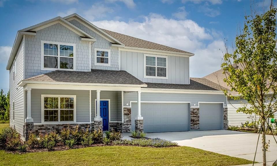 Pre-Construction. To be built. Welcome to the Carlisle, a two-story single-family home designed for comfortable and efficient living. This floor plan offers exceptional finished living space, engineered for optimal flow and convenience throughout. The first floor features a large great room that seamlessly flows into the gourmet kitchen, complete with upgraded quartz countertops and high-end appliances. You’ll also find a media/flex area that can be tailored to your needs, and a bed/bath setup for convenience and flexibility. Extensive ceramic tile flooring throughout the main areas adds both style and durability. Upstairs, the home offers four bedrooms, including the luxurious master suite, a true retreat featuring a soaking tub, a large shower, and a spacious walk-in closet. Both the master and guest baths are upgraded with tile shower enclosures, adding a touch of elegance. There are additional spaces on the second floor perfect for gathering, gaming, exercise equipment, or work stations. The full-size laundry room, conveniently located upstairs, includes a washer and dryer for your convenience. A stone-accented front elevation gives the home a stunning curb appeal, complemented by beautiful landscaping with an irrigation system, ensuring your yard stays lush and vibrant. Enjoy peaceful views as the home is canal-facing, offering a serene backdrop. The 3-car garage provides ample storage and parking space. Step outside to enjoy a 10x22 screened porch, perfect for relaxing or entertaining. The Carlisle plan is ready to be your new home, offering a perfect blend of space, function, and style. Don’t miss the opportunity to make it your own!