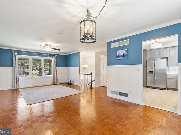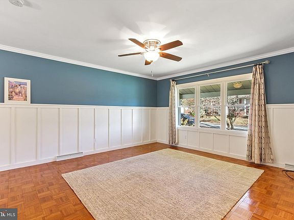 - Ceiling Fan(s), Crown Molding, Dining Area, Floor Plan - Traditional, Wainscotting