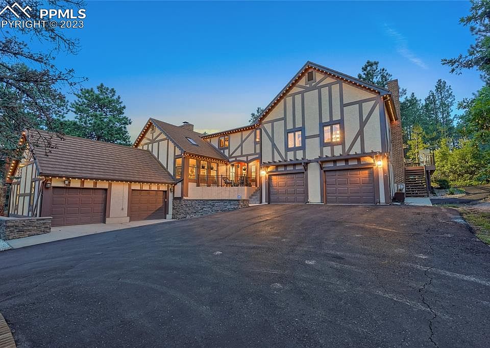 This STUNNING Tudor Woodmen Estates home is a perfect blend of mountainous solitude & luxury living! Sitting on 3 forested acres of perfection, this home feels worlds away & yet sits just minutes from trails, schools, shopping, military bases & more! This one-of-a-kind home was truly designed to create space for all your family & guests’ needs. The main level affords a sunny formal entry, spacious living room w/ a cozy gas burning fireplace, a sunny corner sitting room; airy sunroom; formal dining room & a Chef’s DREAM kitchen! Kitchen includes: a sub-zero fridge, 5-burner gas range/oven w/ custom hood, bar seating island w/ built-in glass shelving & work sink, large pantry & breakfast nook. Moving midway up the stairs you’ll find one of the homes main features- an enormous wood beamed great room that includes: a large woodburning fireplace, wet bar, ¾ bathroom & a private deck (making it also a wonderful rentable studio)! At the top of the stairs, you'll find 3 guest bedrooms, hall full bath & the primary bedroom retreat which includes plush carpeting, built-in shelving details & graciously opens to a private spa bathroom that boasts a large corner soaking tub, steam enclosure shower, dual vanity sinks, & fantastic walk-in closet w/ washer & dryer connections. The basement is also perfectly designed to include a lovely kitchen w/ granite counter, wood laminate flooring, living room/media room w/ projector & surround sound system, 2 spacious bedrooms, laundry room, a large ¾ bath w/ a large step-in shower, and private access to the homes 2-car garage (making this also a terrific rentable 2nd space)! Other home details include an additional a 4-car attached garage with access into home main living space, 4-car detached garage, fenced backyard with play area, leveled area for a large pool, raised gazebo that hosts a splendid hot tub, covered corner patio with café lighting, TrimLight lighting, and a paved walking path that wraps around the home.