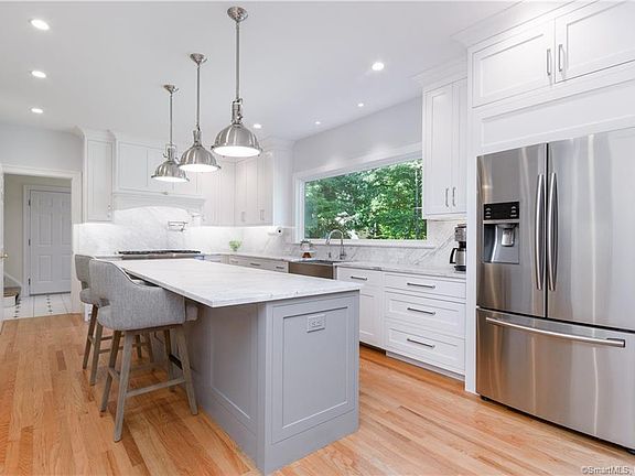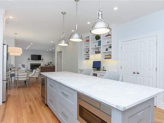 Beautiful colonial on cul-de-sac in sought after South Wilton Meadows neighborhood. With $250k+ in improvements you won't want to miss it This classic, quality built center hall colonial welcomes you with double story entry filled with natural light and 9 ft ceilings through the rest of the open floor plan. The first floor offers generous office, perfect for working at home and living room with fireplace that leads into the dining room. The new gourmet kitchen features marble countertops, custom cabinets, built-ins, oversized island and high end stainless steel appliances, including 6-burner gas range with double oven and grill. The kitchen opens to the family room with a second fireplace and new custom built mantle. The first floor is completed with 2 half baths.Upstairs you will find 3 large bedrooms+2 add'l full baths, primary bedroom w/ensuite full bath and walk-in closet. Don't miss the huge bonus room over the garage w/custom built-ins and new carpeting, perfect for play. Large laundry room is conveniently located on the second floor. The finished basement adds an additional 1,142+ sq ft of living space w/add' full bath and wood burning stove, perfect for workout/movie nights or even a second office to work/study from home.The walkout finished basement opens to large flat backyard perfect for soccer or lacrosse practice or even possible a pool Ideal neighborhood to walk dogs, ride bikes etc. Close to train, major highways, Westport and Wilton town centers. A MUST SEE