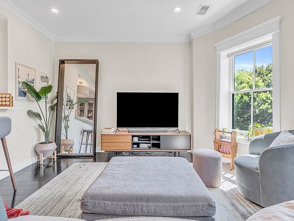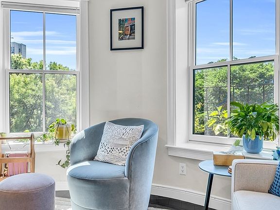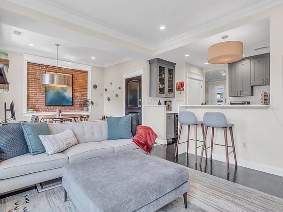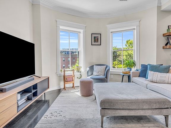Enjoy life in this sun-splashed, over-sized 2-bedroom home in the center of one of the South End's most picturesque Victorian squares! Enter to open bow front living/dining room filled with light and overlooking the treetops and fountain. Features include gleaming 5" red oak floors, significant crown molding, exposed brick, and recessed lighting. Thoughtfully renovated stainless steel kitchen complete with state-of-the-art appliances including Bosch range and Maytag refrigerator. Open design features granite counters with handy breakfast bar open to living area and sleek shaker style cabinetry. Additional bar area opposite the kitchen with dual-temp wine cooler. Two generous bedrooms with custom fitted closets and one with door to quiet rear deck with morning sun. Full-size stack laundry. Luxurious bathroom of marble, travertine, and inlaid onyx featuring Kohler whirlpool tub, custom shower enclosure, mirror, lighting, and hardware. A great home offering the best in urban living!
