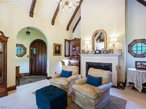 Welcome to this enchanting home in Ridgewood. Public record states it is a Tudor; others may call it a cottage. Either way, it is a special property that has been lovingly maintained. Great Room features vaulted & beamed ceilings, gas fireplace, blt/in bookcases, & opens into Dining Room w/windows overlooking rear yard. Pretty kitchen w/white cabinets, island, ceramic floor, beamed ceilings, & rear access & view to the special patio w/wrought iron railing & retractable awning. Adjacent to kitchen is the cozy den to enjoy. Owner's suite is only a few steps up from main floor; double closets, & also boasts lovely renovated owner's bath w/heated tile floors, spacious walk-in shower, double sinks, & built-ins. Second level presents balcony overlooking Great Room, three spacious bedrooms, cedar closet, attic fan, & full bath. Full basement w/glazed tile, glass block windows, epoxy flooring, laundry area, delightful carpeted room (solid wood walls) for kids, office, crafts, etc., & half bath