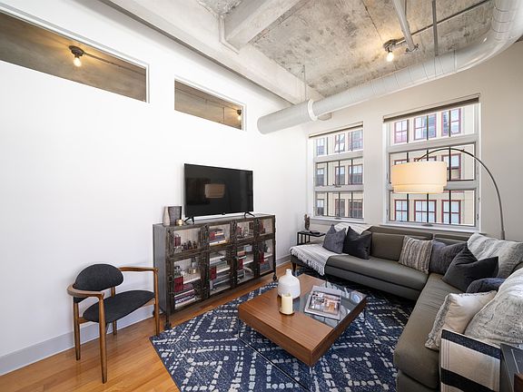 Experience city living is at its finest with this industrial-chic condo at 140 Bay St, the re-imagined Cooke Warehouse located in downtown Jersey City’s Powerhouse Arts District. Featuring a generous 880 sq. ft. open layout, this one bedroom plus den loft has plenty of space to sprawl out. Located on the building corner encompassed by two walls of huge industrial windows, the open living area with soaring 12’ ceilings lets in tons of natural light and clears the buildings across the street allowing for open views and sky. The home features a chic, recently-renovated bathroom & kitchen with stainless appliances, modern tile backsplash, grey cabinets and dark stone countertops. This unit also features a true one bedroom with pocket door entry and expansive walk-in closet. There’s tons of character in this converted warehouse with exposed concrete beams, ductwork, concrete & brick. Other key features of the home include central air, in-unit washer dryer, walk-in closet, and a dedicated pantry. There’s also a built-in Murphy bed to accommodate overnight guests. The building even has a common roof deck with sumptuous plantings, lounge furniture and amazing views! The Powerhouse Arts District is Downtown Jersey City’s urban warehouse district; it’s just a few steps from the Grove Street Path station, the Newark Ave. pedestrian plaza, and a multitude of shops, restaurants & grocery stores.