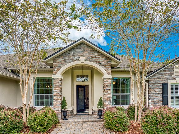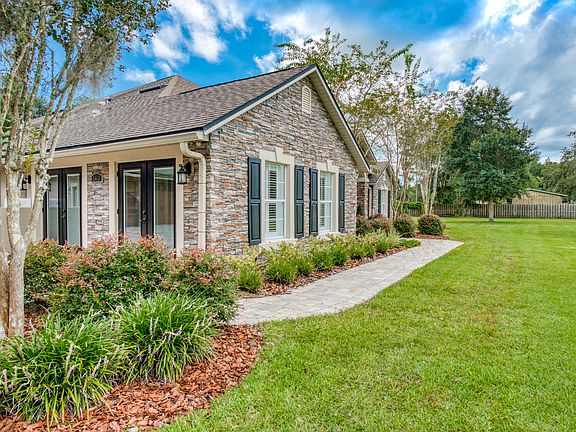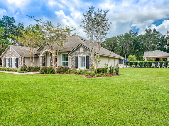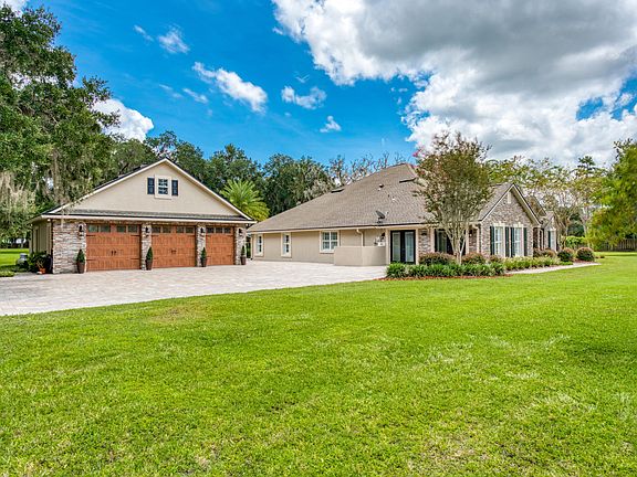 Gorgeous luxury estate nestled in the country on 3.86+/- acres of land with beautiful large oak trees. Relax and enjoy your own private estate, plenty of room to roam and entertain. This block home features large in ground sports pool, heated & cooled w/ tanning ledge, travertine decking; large 20x40 screened lanai with travertine flooring, & fireplace, SUMMER KITCHEN includes stainless steel appliances, granite counter, bathroom, fireplace & gas fire pit. Home has engineered hard wood floors throughout, custom kitchen cabinets, built in wine cabinet, stainless steel KitchenAide appliances, fireplace in master bedroom, marble in both bathrooms, separate office and detached 3 car garage. Also has 30 X 56 3 bay shop. NO HOA Home Warranty included. Easy commute to Jax & Orange Park.