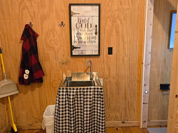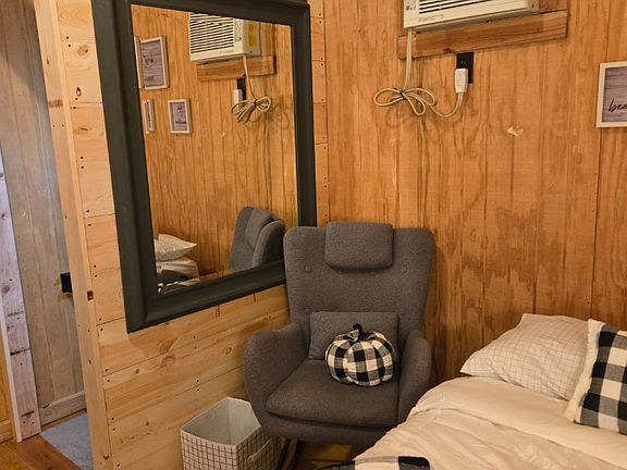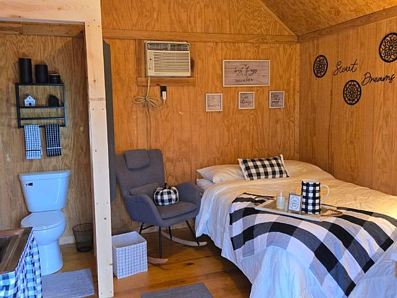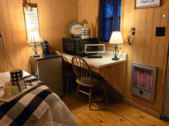 This is a one room cozy cabin. Includes heat, air, electricity. Small appliances (ie, mini refrigerator, toaster oven, microwave, coffee maker & 2 burner hot plate) included. The cabin does not have interior plumbing or running water, but the park does have bathhouse and laundry services on site. Located appx. 75yrs away.