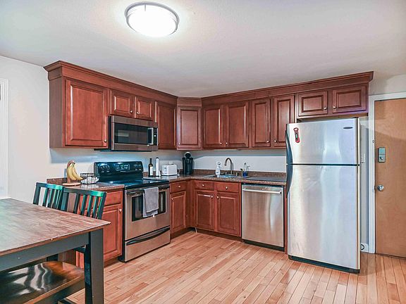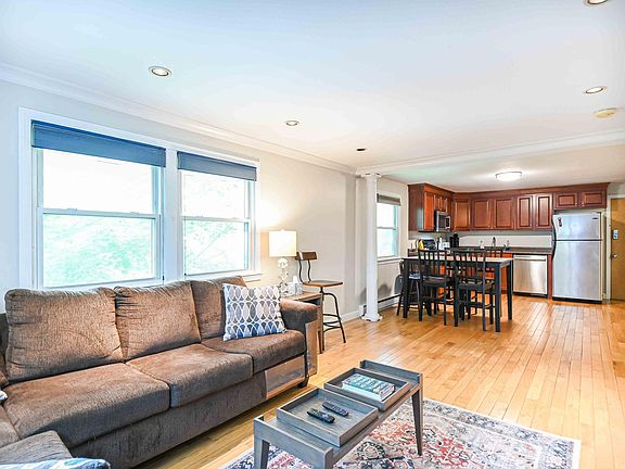 Top floor 2BR open concept unit in desirable West End with 2 parking spots. Condo has hardwood floors in kitchen and LR, new carpet in BRs and tile floor in bathroom. Stainless steel appliances, new washer/dryer in unit. Heat is electric and annual electricity cost is approximately $2,000 (for all appliances, utilities and heat). Owner pays for water; tenant pays for utilities and cable. Small pets may be permitted with additional fee. Six month lease, renewable upon agreement to annual lease. Condo association takes care of landscape and plowing. Two parking spaces in back of building, not assigned. There is a small storage shed common to other units (6 in total) as well as shared attic space on top floor.