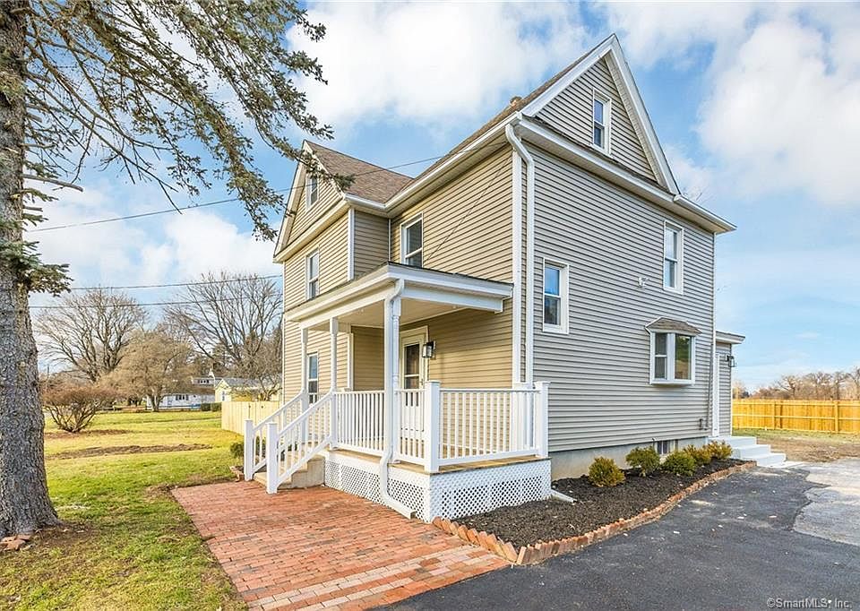 Totally renovated stylish farmhouse colonial located in the rural area of South Windsor with front porch and just steps to historical Main Street. The home borders farm land on Chapel Road to offer the quintessential New England feel. 3 bedrooms and 2 full bathrooms, 1 car detached garage. Super chic open kitchen with center island, stylish tile backsplash, quartz counters. Formal dining room and living room with trendy new light fixtures and gleaming refinished hardwood flooring throughout. First floor laundry. Full bath on each floor with tile and all new fixtures. Unfinished lower level for plenty of storage, with a hatchway. New vinyl siding. Everything has been done! The lot is .25 acres but feels large and is flat and usable.