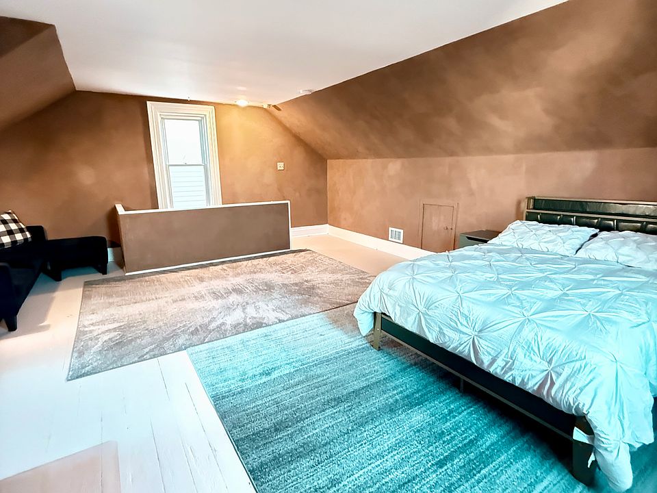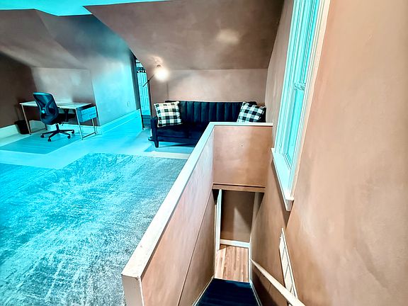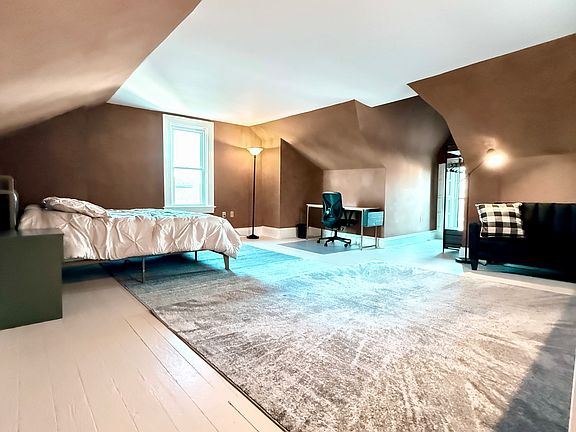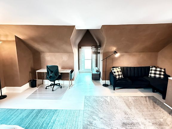 This is an extra-large furnished suite located on the top floor, offering privacy, space, and comfort. The room features a full-size bed with a comfortable mattress, dedicated workspace with desk and chair, cozy sofa, and plenty of open floor area. Natural light fills the room through multiple windows, highlighting the unique ceiling angles and warm tones that make the space inviting.