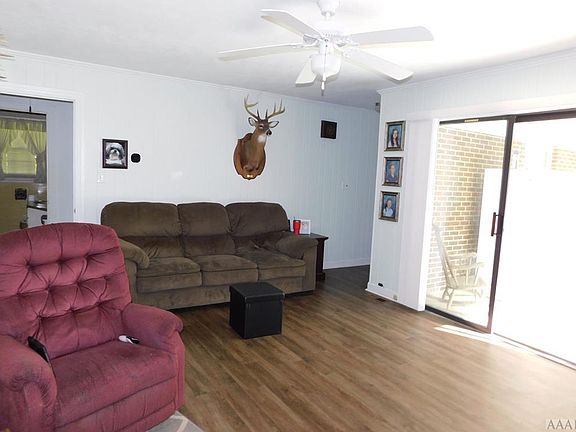 This 3 bedroom, 2 bath home is conveniently located just outside of Ahoskie. The home has had recent updates including new flooring in many rooms, fresh paint, new screening on the porch, updated kitchen appliances & a storage building with a roll up side door. The living room & adjacent dining room open to an eat in kitchen. The nearby den has a fireplace with some built in shelving. The master bedroom has an attached full bath & the other 2 bedrooms share a nearby full bath. The screened porch is off of the den & there is an attached carport.