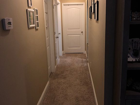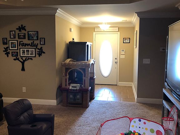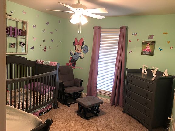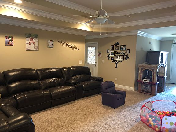 This gorgeous 3/2 home has 1808 sq. ft. of well-appointed living space. Built in 2013, it is nestled on .75 acres & has huge front & back yards for your family's enjoyment. You're greeted by a beautiful brick façade on the front with a covered porch. The tile entryway leads you to a large, carpeted living room with beautiful double trey ceilings & crown molding. The open-style floor plan is perfect for hosting gatherings with friends & family. The roomy kitchen is stunning with tile floor & backsplash, stainless steel appliances, & handsome, farm-style cabinetry. There is a breakfast bar & dining area with plenty of windows overlooking the fenced-in backyard. The hallways & bedrooms are carpeted & ceiling fans are throughout. The master bedroom features the lovely double trey ceiling , crown molding, & walk-in closet. The master bath is sheer perfection with a jetted tub & separate shower, beautiful tile flooring and backsplash, and double sinks. The storage shed is huge & handy!