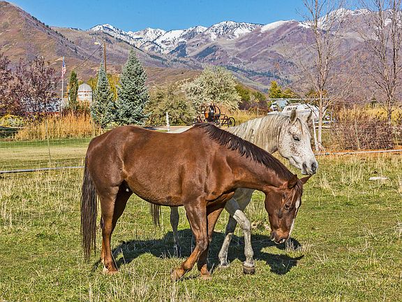 Price reduced due to sell of additional acreage - Make sure to watch the Tour to view the entire home! This quality, custom home is country living at it's finest. Come home to 1.82 landscaped acres nestled at the end of a tree lined private street in the heart of Midway. Designed with a light-filled floor plan, your family will love the 360 degree views of the entire valley, 2 kitchens, 2 family rooms, 2 laundry rooms, vaulted ceilings, horse property, and fully-mirrored, dance/fitness studio. Enjoy the gorgeous HEBER VALLEY with convenient access to world class skiing, fishing, golfing, water sports and myriad equestrian activities. Miles of horse trails starts from your backyard. Only minutes to SUNDANCE SKI RESORT, DEER VALLEY SKI RESORT, PARK CITY SKI RESORT, only 45 minutes from Salt Lake International Airport. All information herein is deemed reliable but is not guaranteed. Buyer is responsible to verify all listing information, including square feet/acreage, to buyer's own satisfaction. The property has an additional back 2.72 acres outside of the fenced area that is being sold to a neighbor who is purchasing to protect from any future development. This home includes a chicken coop, tractor shed and cover, garden, tether ball pole, sand box and fire pit. Inside, an office and receiving arched doorway room adjoin the foyer with a large stone fireplace in the background. This great room, with cathedral ceilings and built-in entertainment center, is highlighted by large picture windows that frame Mt. Timpanogos providing stunning views of every season. A dining room or additional study overlooks the main floor deck at the back of the house. The master bedroom is also on the main floor with equally impressive views of sunsets behind Mt. Timpanogos. The master bath has a raised, jetted tub, a walk-in shower, makeup counter and a walk-in closet. A guest bathroom and large laundry/sewing room finish off the main level. The lower level is a self-contained 2nd residence with separate back entrance and inside stairs to the main floor. It includes a cozy fireplace/hearth with a large living room adjoining a kitchen with options for all appliances including a dishwasher and refrigerator. Two bedrooms, two full baths, and a wonderful mirrored fitness/dance studio is also on the lower level. There is a study area with built-in bookshelves and file cabinets and another laundry room and large cold storage room on the lower level. A fun playroom under the stairs and a performing stage make this a wonderful play area for young and old. Year-round stream bordering a circle drive and ample parking and outdoor storage area. 3 car garage with extra deep and wide RV parking with 220 volt power access and heater. The home also includes a natural gas backup power generator and a heated roof.