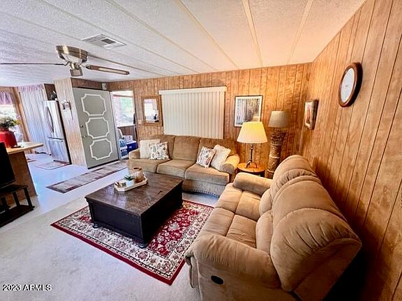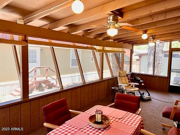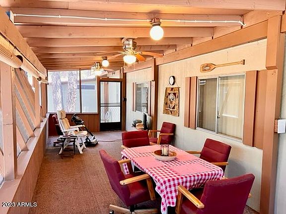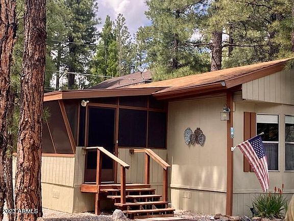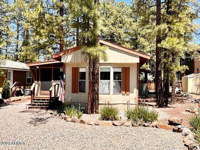 Cozy, move-in ready, furnished home in the cool pines of Munds Park. Relax, unwind, and dine on the large, 10x30, screened porch or enjoy time on the smaller screened porch on the other side of the home, great for an outdoor reading nook. The gravel driveway is suitable for RV parking with flower gardens surrounding either side of home, ponderosa pines, as well as great storage in the 9x11 ATV garage! Roomy kitchen has tile backsplash, newer stainless appliances, breakfast bar, bay window, built-in microwave, pantry, new disposal. Both bedrooms have full length closets, ceiling fans throughout, new vanity, sink and flooring in bathroom. This reputable Palm Harbor home has newer windows, heat taped water pipes, gutters, extra snow load roof (great for insulation also), perimeter wood skirting on the home and wood fencing in the back. NO HOA! It is 1.7 miles from the Pinewood Country Club and close to the national forest, lake, hiking/ biking trails, park, restaurants, convenient store and more! Munds Park is 17 miles South of Flagstaff and a 2-hour drive from Phoenix. Come see your new home in our neck of the woods!