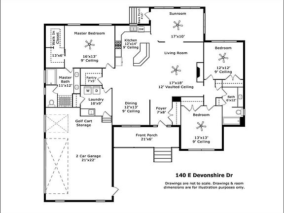 - Rooms: Utility/Laundry, Kitchen, Golf Cart Storage, Bedroom 2, Bedroom 3, Carolina Room, Entry/Foyer, Master Bedroom, Garage, Living Room